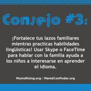 Cuéntanos las experiencias de tu infancia bilingüe o cómo ha sido criar a tus propios hijos bilingües abajo, en los comentarios, para que otros padres que visiten este articulo sepan que funcionó en tu familia. También nos puedes tuitear tus consejos a @MomsRising y @MamasConPoder.